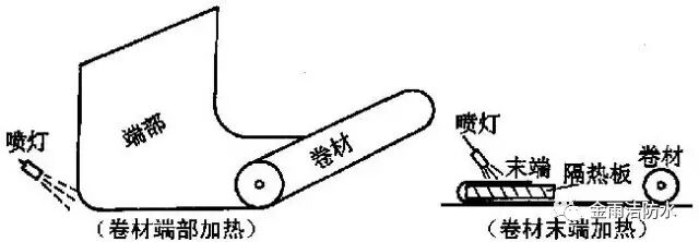 b.熱溶法一般在涂刷基層處理劑8h后進行,火焰加熱器的噴嘴距卷材面的距離約0.5m左右,與基層呈45~600角。