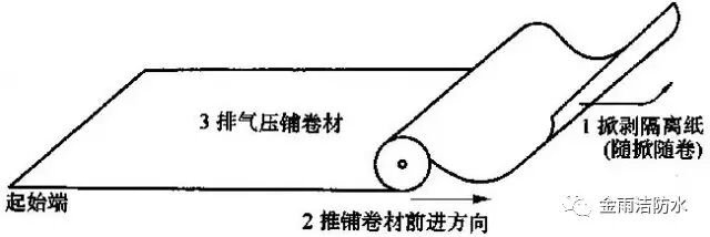 d.撒油法:用于基層不太干燥、需做排氣屋面的情況,在鋪第一層卷材時,先在卷材周邊滿涂瀝青,中間用撒蛇形花的方法撒油鋪貼,其余各層仍按澆油、刮油、刷油法鋪貼。